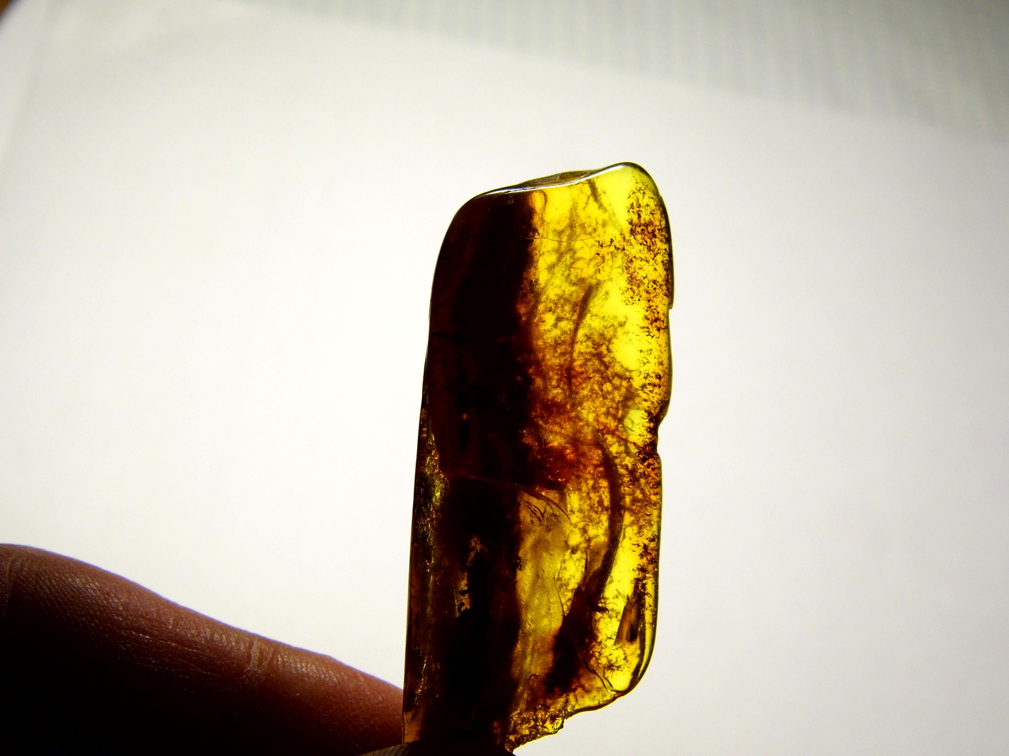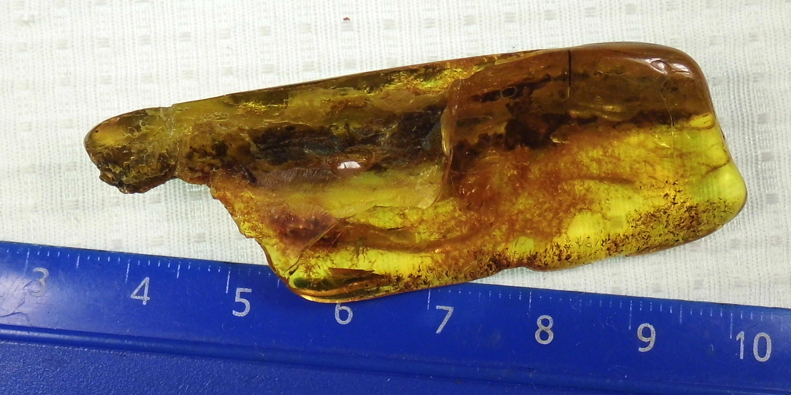Optically this substitute can hardly be distinguished because with it authentic amber colors and limpidity can be obtained. Falsified inclusions are too big and clearly seen, usually inserted in the very center of plastic.