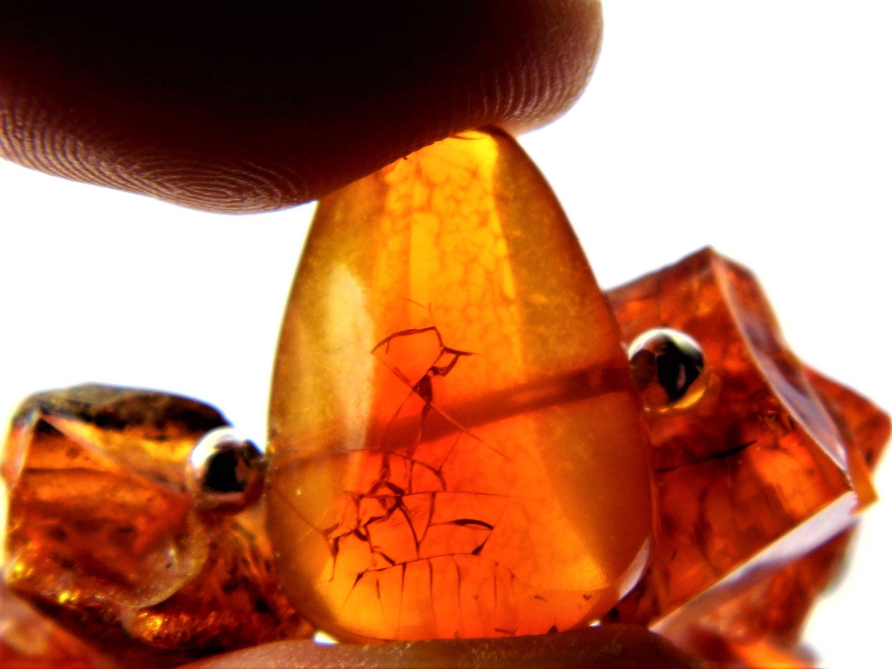 Optically this substitute can hardly be distinguished because with it authentic amber colors and limpidity can be obtained. Falsified inclusions are too big and clearly seen, usually inserted in the very center of plastic.