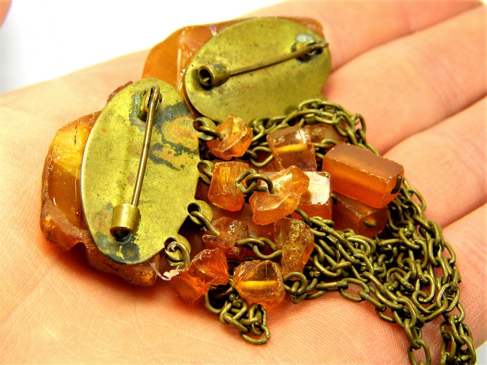 Natural genuine real Baltic Amber and Pressed Amber stone old vintage retro antique authentic double brooch unique women's jewelry.