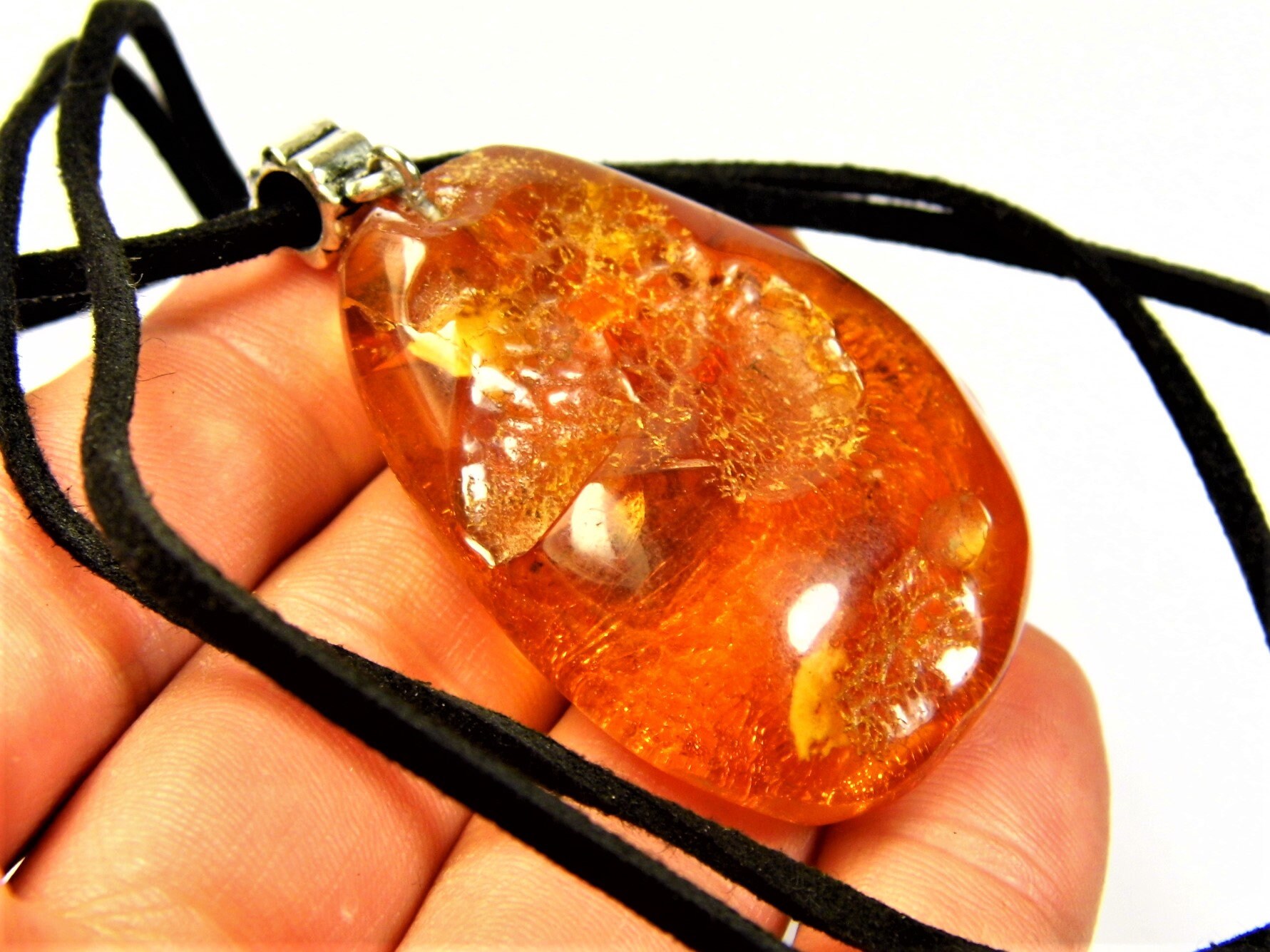 Optically this substitute can hardly be distinguished because with it authentic amber colors and limpidity can be obtained. Falsified inclusions are too big and clearly seen, usually inserted in the very center of plastic.